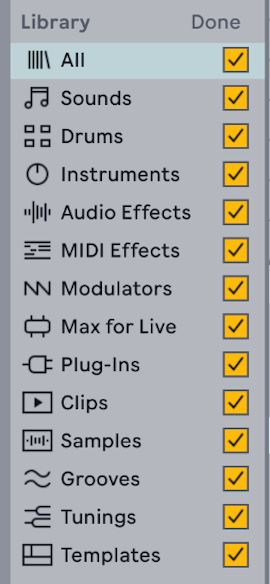 All of Live’s factory content (i.e., content from the Core Library and Live Packs that come with each Live edition) is tagged with a set of descriptive tags. Content from the third-party Packs available in the Ableton webshop is tagged with the tags contained within the “Sounds” filter group.