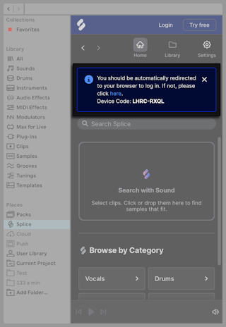 To enable Cloud functionality in Live, select the Cloud label in the browser sidebar. Selecting it displays a message prompting you to sign in to ableton.com to authorize the service. Click the Sign In button to open a web browser and log into your ableton.com user account.