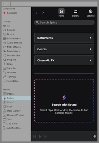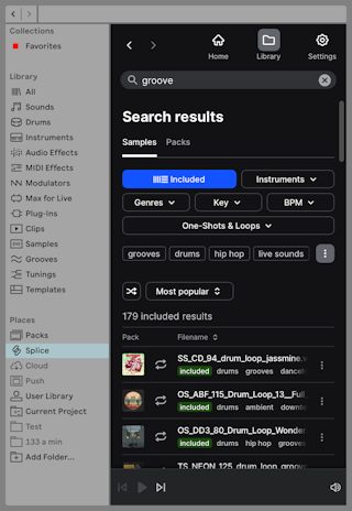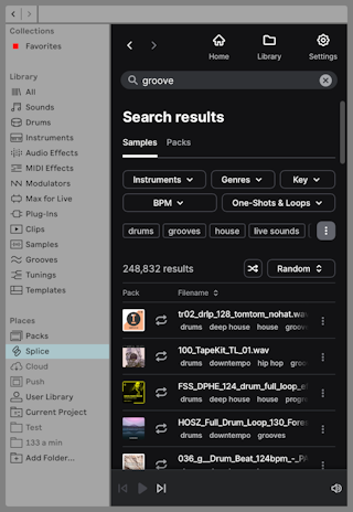 Live’s browser is the place where you interact with your library of musical assets: the Core Library of sounds included with the program, any additional sounds you’ve installed via Live Packs, presets, samples you’ve saved, built-in and third-party devices, and any folders on your hard drive that contain samples, tracks, etc. Additionally, you can access files from Ableton Cloud and Push in Standalone Mode via the browser’s Places section.