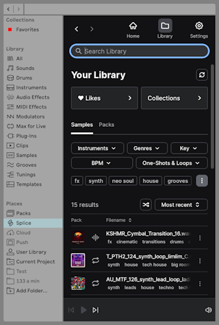 The Library section consists of various labels that contain different browser items organized by type. You can use the search bar or filters to find and explore all of the available instruments and sounds in your library. The Library section is organized as follows: