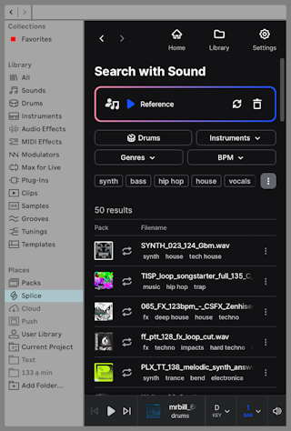 You can further refine your search by selecting tags from various filter groups to narrow the results. For example, if you want to find string sounds, you can type “strings” into the search field and then click on any tags in the Filters view to display results matching only those tag descriptions.