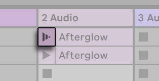 - Selektieren Sie die beiden resultierenden Clips und ziehen Sie sie in die Session-Ansicht, indem Sie den Mauspfeil über den Wahlschalter der Session-Ansicht bewegen. Legen Sie die beiden Clips in einer Spur ab. Dort bilden Sie nun eine Follow-Action-Gruppe.