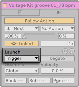 Zu beachten ist, dass eine andere Wahl als “None“ den Clip-Start quantisiert, falls der Clip durch eine Follow-Aktion getriggert wird (siehe Follow-Aktionen).
