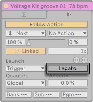 Eine andere Option, die sogar bei ausgeschalteter Quantisierung funktioniert, besteht im Aktivieren des Legato-Modus für die betroffenen Clips. Wenn ein Clip im Legato-Modus gestartet wird, übernimmt er die Wiedergabeposition des vorher in der gleichen Spur gespielten Clips. Sie können deswegen Clips jederzeit und in beliebigem Tempo umschalten, ohne die Synchronisation dabei zu verlieren.