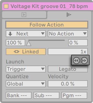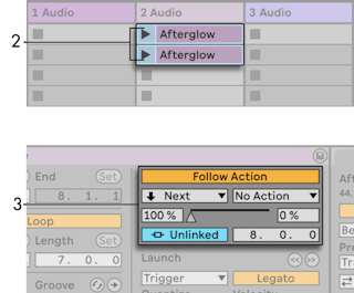 Follow-Aktionen erlauben es, Verkettungen von Clips zu erzeugen, bei denen ein Clip einen anderen auf vorbestimmte oder zufällige Weise (oder beides) startet. Mit der Follow-Action eines Clips bestimmt man, was mit anderen Clips in der gleichen Gruppe nach der Wiedergabe des Clips passiert. Eine Gruppe wird durch Clips definiert, die sich in aufeinanderfolgenden Slots eine Spur befinden. Spuren können eine beliebige Anzahl von Gruppen besitzen, die durch leere Slots voneinander getrennt sind.