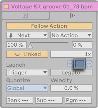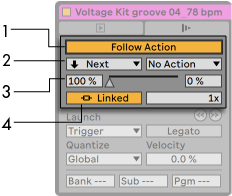 Ein Clip kann auch vom Beginn bis zu einem Punkt abgespielt werden, wo seine Follow Action mit "Next" zum nächsten Clip wechselt. Im nächsten Clip der Gruppe kann das gleiche Sample verwendet werden, diesmal allerdings geloopt. Der zweite Clip kann eine beliebige Follow-Action-Einstellung haben, so dass er beispielsweise unendlich lange weiterspielt oder nach einer bestimmten Zeit oder mit einer bestimmten Wahrscheinlichkeit zum nächsten Clip der Gruppe wechselt.