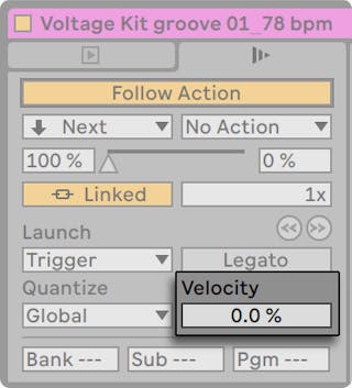 Der Parameter für die Velocity-Empfindlichkeit erlaubt es Ihnen, die Auswirkung der Anschlagsstärke von MIDI-Noten auf die Lautstärke des Clips zu bestimmen: Ist er auf Null gestellt, hat die Velocity keinen Einfluss auf die Clip-Lautstärke, bei 100 Prozent spielen leicht angeschlagene Noten den Clip ganz leise. Näheres über das Abspielen von Clips über MIDI behandelt der entsprechende Abschnitt (siehe Fernsteuerung über MIDI und Rechnertastatur).