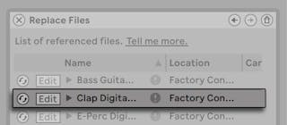 - Several candidates found — Live requires your assistance: Click the Hot-Swap button (i.e., the leftmost item in every line of the list of missing files) to have the browser present the candidates in Hot-Swap Mode. You can now double-click the candidates in the browser to load them, as the music plays if you like.