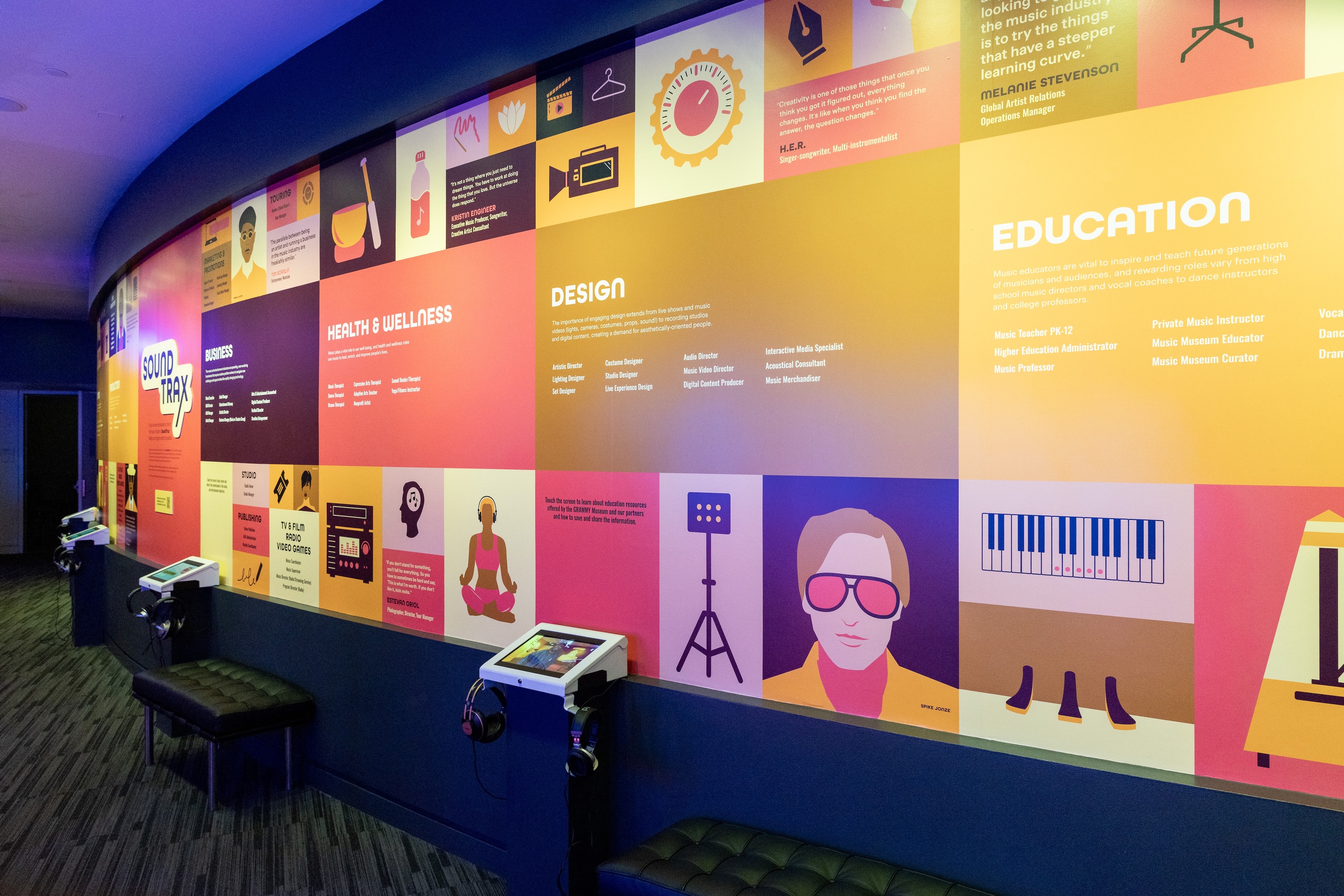 Along a curved wall, visitors can discover the wide variety of career pathways in the music industry