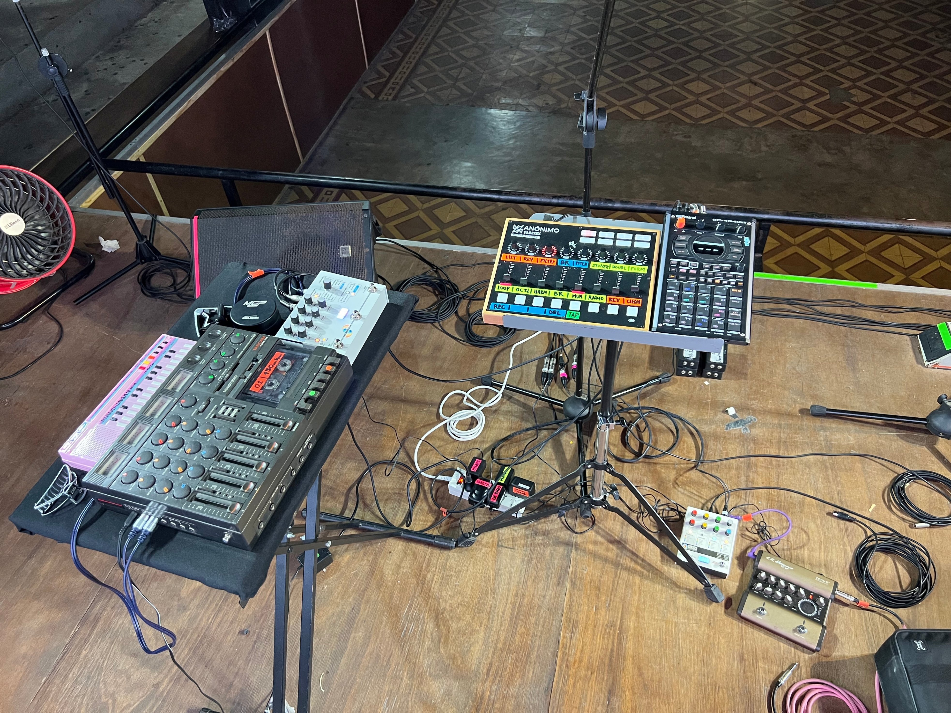 Juana Aguirre’s stage station includes a four track cassette player and custom made vocal processing controller