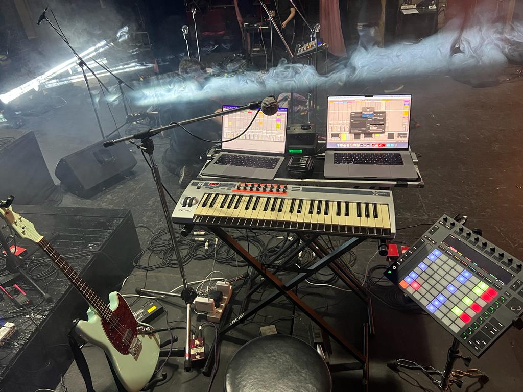 Cruz: Both Juana and I have computers running Live. For Juana’s vocal processing setup we had these really old AKAI MPD 32s, which are like a controller version of the MPC, and they really came in handy because they have faders, buttons and pads. I brought a keyboard controller that I’ve had since I was 18, but I acquired a Push unit back in 2021 so I decided to use it as a control centre for changing presets, tempo, effects processing and playing sampled one shots. The Push has actually been very handy because it allows me to look at the screen and explore a lot of production elements while we’re rehearsing.