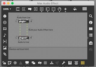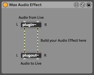 Max devices (or “patches“) are constructed of objects that send data to each other via virtual cables. An empty Max Audio Effect, for example, already contains some of these elements: the plugin~ object passes all incoming audio to the plugout~ object, which then passes the audio on to any additional devices in the chain.