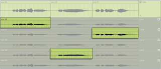 For every comp in a main lane, the source material in the corresponding take lanes is highlighted in the track’s color. All unused take lane material is displayed in a desaturated shade of the track’s color. This makes it easier to identify which recorded material is part of the comp. Note that source highlights will only be shown when the clips have matching positions and properties.
