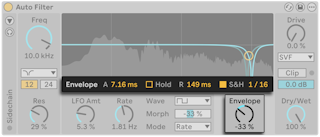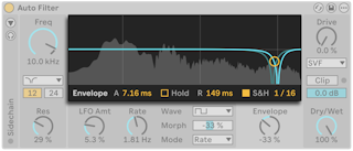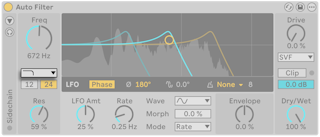 Auto Filter is a filtering effect that modifies the incoming sound by applying frequency-selective filters. It offers various filter types and filter circuit types that emulate classic analog filters. The device’s LFO modulation and envelope follower help create dynamic, tone-sculpting effects. The envelope follower can respond to the filtered signal itself or to an external sidechain input.