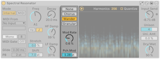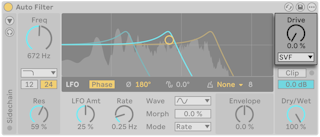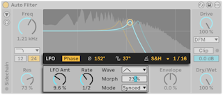 Auto Filter can apply independent LFO modulation to the left and right channels, allowing the modulation to be offset across the stereo field. Use the LFO Stereo Mode toggle at the bottom of the display to switch between two stereo offset modes: Phase and Spin.