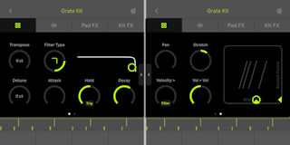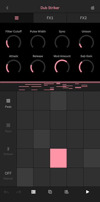 The recorded sample will automatically be cropped to start playing at the first detected transient. You can drag the sample waveform left or right to set a different starting point. Or you can use a two-finger pinch gesture to zoom in and out of the waveform while adjusting the starting point. You can drag up or down on the sample waveform to adjust the sample’s volume gain amount anywhere between +24 and -70 dB.