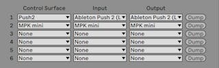 コントロールサーフェスは[Link/Tempo/MIDI]タブのメニューから定義できます。 Liveでは、一度に6つまでのコントロールサーフェスを使用できます。