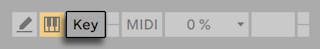 - Liveスクリーンの右上方にある[KEY]スイッチをクリックし、キーマップモードをオンにします。 キーマップモードがオンになると、アサイン可能なインターフェースが反転します。 マッピングブラウザーも使用可能になります。 ブラウザーが非表示の場合、[表示]メニューのコマンドを使って表示させておきます。