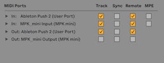 ご使用のMIDIコントロールサーフェスが[Link/Tempo/MIDI]環境設定の[コントロールサーフェス]セレクターにリストされていない場合は、このタブの[MIDIポート]セクションから手動マッピングを有効にすることができます。