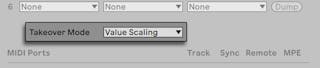 絶対値を送信するMIDIコントロール(フェーダーなど)がバンクスイッチ設定で使用される場合(コントローラーバンクを使って複数の異なるパラメーターにアドレスする)、バンクのスイッチ後初めてコントロールを動かす際に起こる値のジャンプに対し、Liveがどのように反応するかを設定する必要があります。 テイクオーバーモードは、以下の3種類から選択できます。