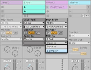 This is accomplished by setting the new MIDI track’s Output Type chooser to the pad track. Note that the Output Channel chooser now offers a selection of destinations: We can either feed the new track’s output into the input of the pad track, or we can directly address the Simpler. The “Track In“ option in the Output Channel represents the pad track’s input signal (the signal to be recorded), which is not what we want. We instead select “Warm Bubbly Pad“ to send the new track’s MIDI directly to the Simpler, bypassing the recording and monitoring stage. With this setup, we can choose to record new takes on either track and they will all play the same pad sound.