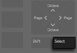 Select — In Session Mode, hold Select and press a clip to select the clip without launching it. This will also display the clip name in the display. In Note Mode, hold Select and press a Drum Rack pad to select it without triggering the pad.